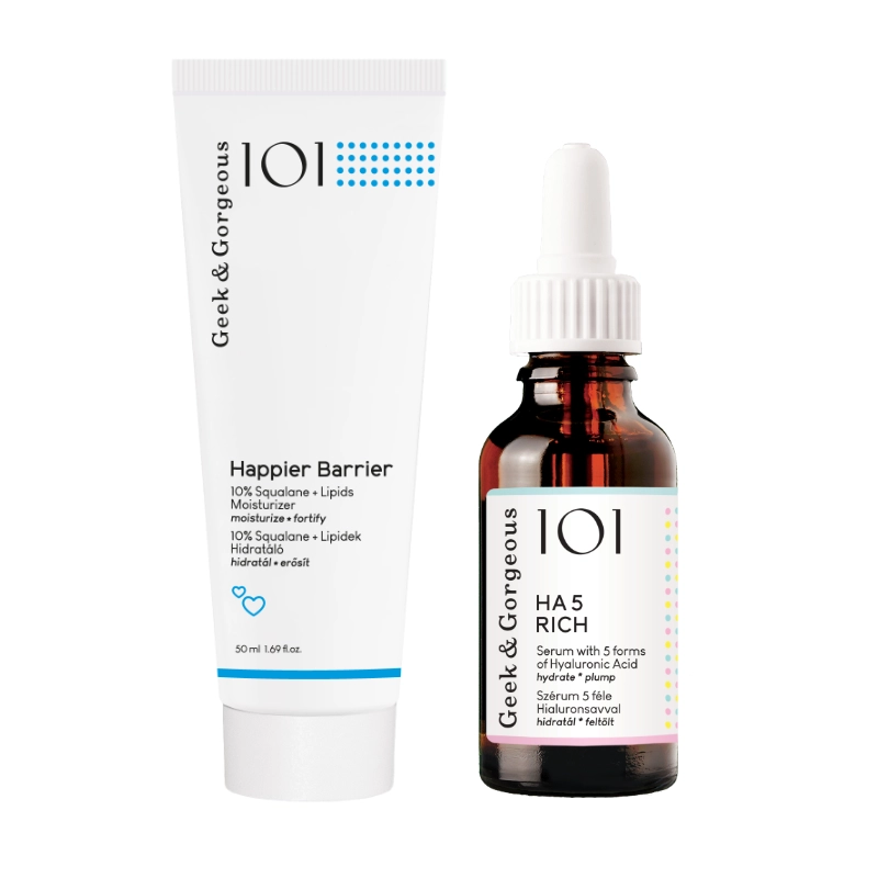 Duo pentru ten uscat, deshidratat, Ser cu acid hialuronic 30ml si Crema hidratanta cu Squalane 50ml Geek & Gorgeous: