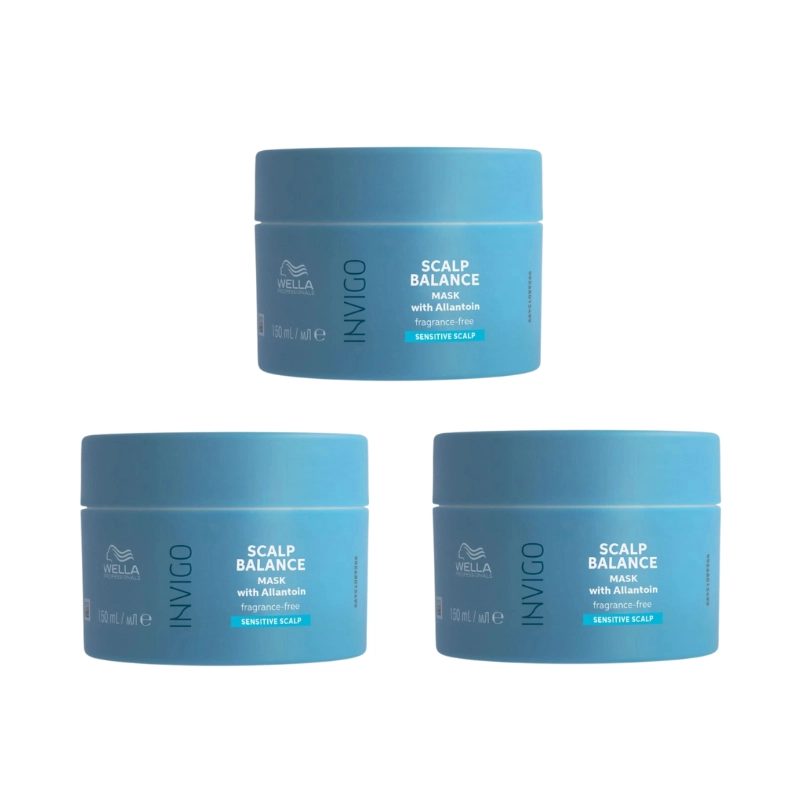 3 x Masca pentru scalp sensibil INVIGO SENSO CALM MASK Wella Professionals 150ml - Este o masca cu o formula usoara, fara parfum, special conceputa pentru ingrijirea scalpului sensibil si iritat. Hidrateaza delicat datorita ingredientelor sale benefice, iar alantoina din compozitie ajuta la calmarea pielii si la prevenirea iritatiilor, a mancarimilor si disconfortului. Ofera o senzatie de prospetime de lunga durata si lasa parul moale, stralucitor si usor de pieptanat.