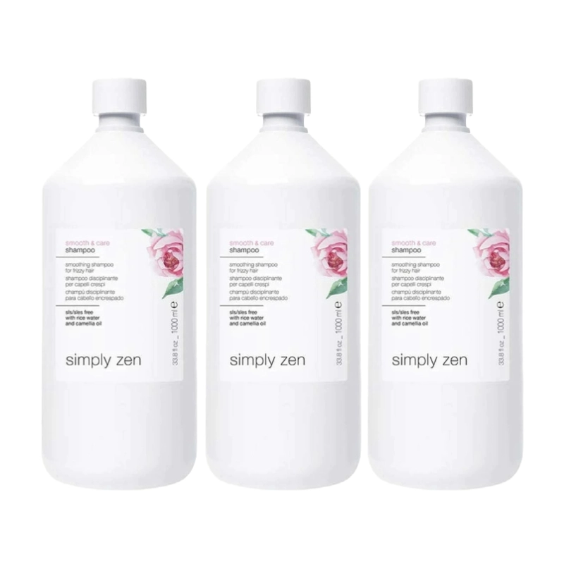 3 x Sampon pentru pentru indisciplinat Smooth & Care 1000ml Simply Zen - Pentru a va mentine parul sanatos, stralucitor si vital, este important sa ii oferiti o ingrijire corecta iar aceasta incepe cu spalarea regulata a parului! Samponul Simply Zen Smooth & Care Shampoo ajuta la indepartarea eficienta a tuturor impuritatilor, a grasimii, a acumularilor produselor de styling si a altor produse cosmetice din par si de pe scalp. In plus, parul capata o senzatie de prospetime si curat, avand efect si anti-frizz.
