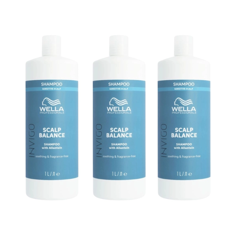 3 x Sampon pentru scalp sensibil INVIGO SENSO CALM SHAMPOO Wella Professionals 1000ml - Are o formula usoara, fara parfum, special conceputa pentru ingrijirea scalpului sensibil si iritat. Curata cu delicatete, indepartand eficient excesul de sebum si impuritatile, iar alantoina din compozitie ajuta la calmarea pielii si la prevenirea iritatiilor, a mancarimilor si disconfortului. Ofera o senzatie de prospetime de lunga durata si lasa parul moale, stralucitor si usor de pieptanat.