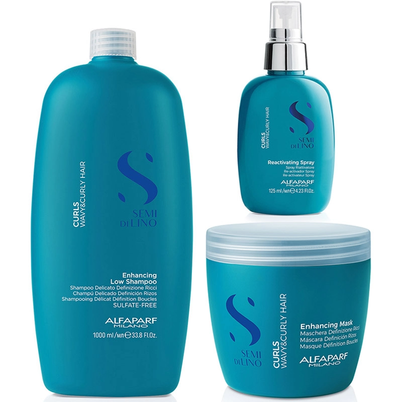 Pachet par cret sau ondulat semi di lino curls - sampon 1000ml, masca 500ml, spray 125ml