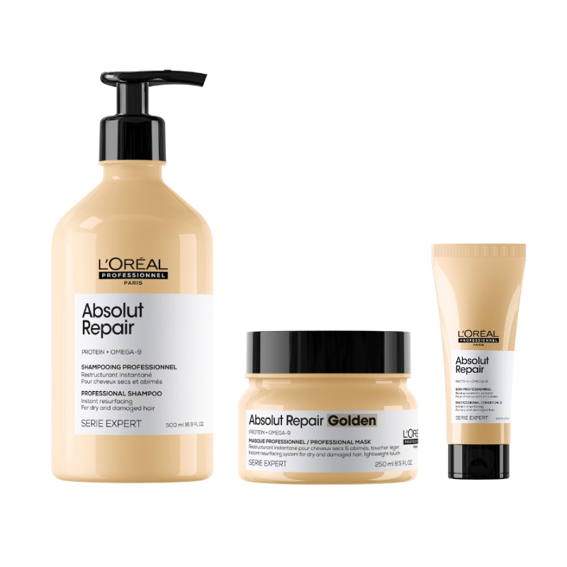 Pachet pentru par deteriorat absolut repair - sampon 500ml, balsam 200ml, masca aurie 250ml