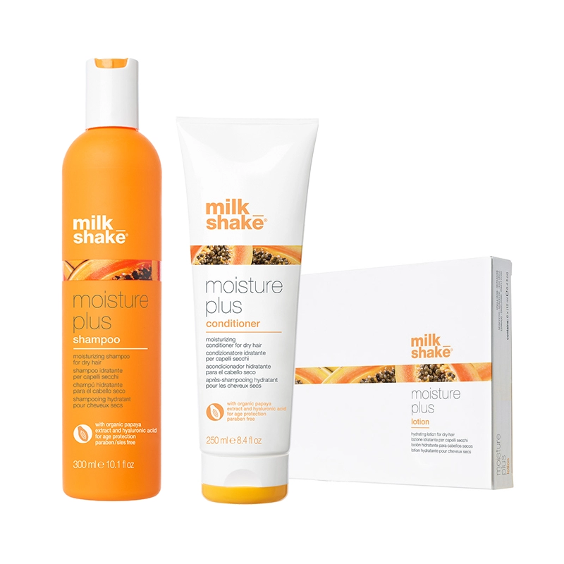 Pachet pentru par uscat Moisture & More - Sampon 300ml, Balsam 250ml, Fiole 6x12ml Milk Shake contine: