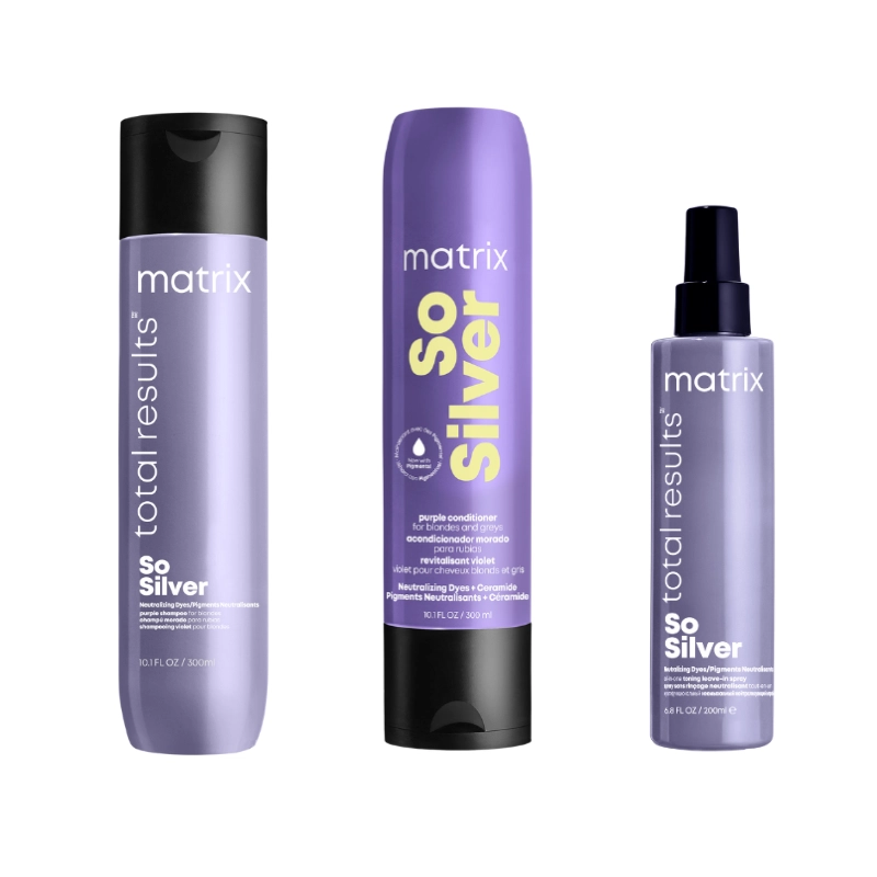 Spray leave-in pentru neutralizarea nuantelor de galben So Silver Toning Spray Matrix – aliatul ideal pentru parul blond sau gri, acest spray multifunctional fara clatire neutralizeaza eficient tonurile galbene nedorite si transforma instant look-ul, oferind parului hidratare, netezire si stralucire. Cu o formula cu acoperire construibila, spray-ul actioneaza ca un tonic de corectare a culorii si, in acelasi timp, ca un tratament complet: reduce efectul de electrizare, disciplineaza firele rebele, imbunatateste aspectul varfurilor despicate, previne ruperea la pieptanat si descurca parul cu usurinta. Hidrateaza, netezeste cuticula si pregateste parul pentru stilizare, lasandu-l mai matasos si vizibil mai sanatos. (vezi produsul aici)