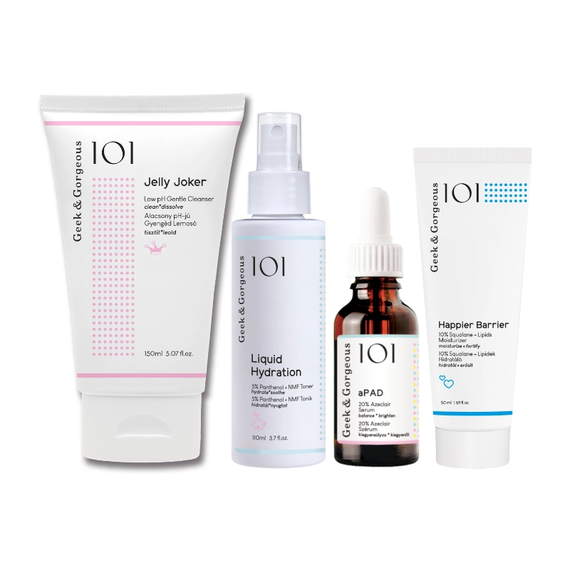 Rutina de dimineata pentru tenul sensibil, cu roseata Geek & Gorgeous contine: